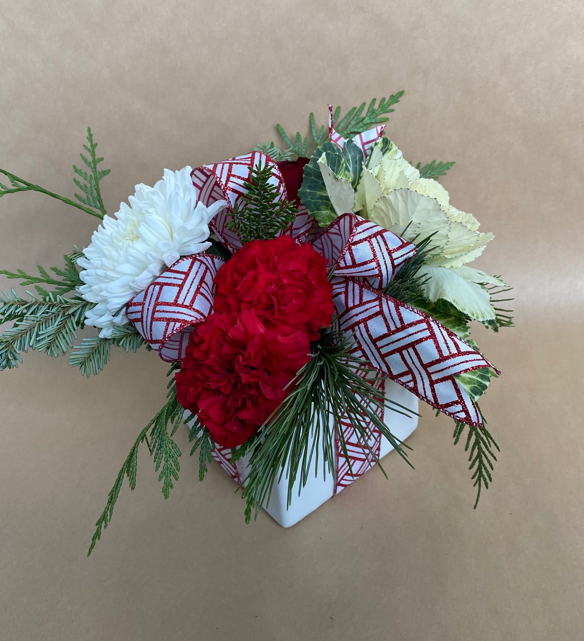 Designed using seasonal blooms like carnations, mums, roses etc. & seasonal foliage in a 5" cube, wrapped in your choice of red or green ribbon. Perfect for a desk or a dining table, gift it to a loved one or to yourself! Looking to add some volume? Select one of the deluxe options to add more blooms!